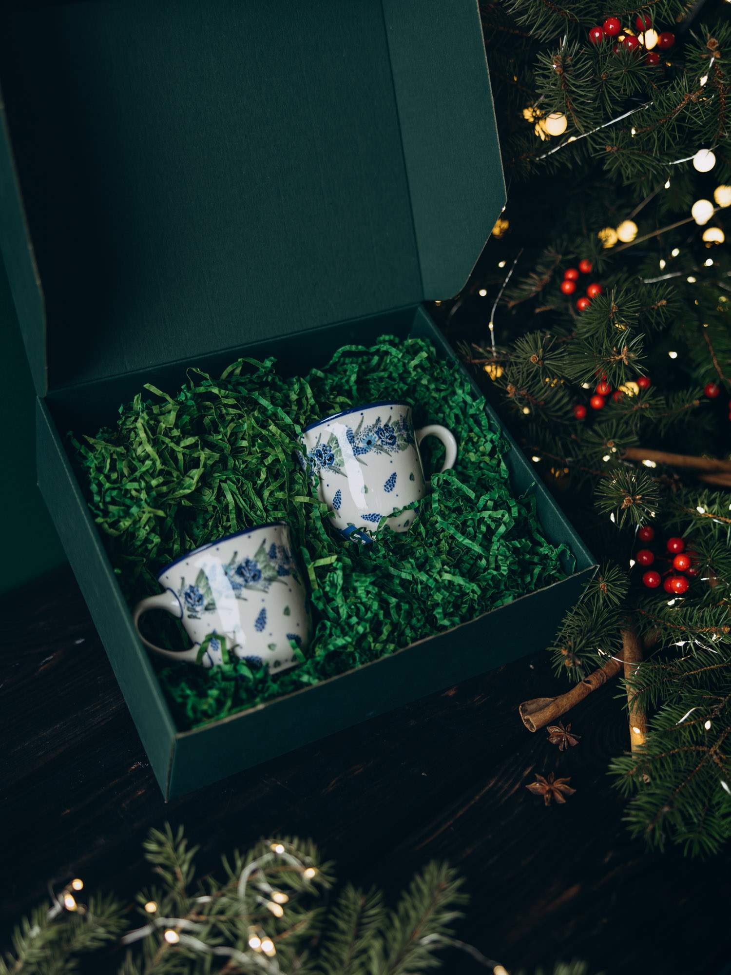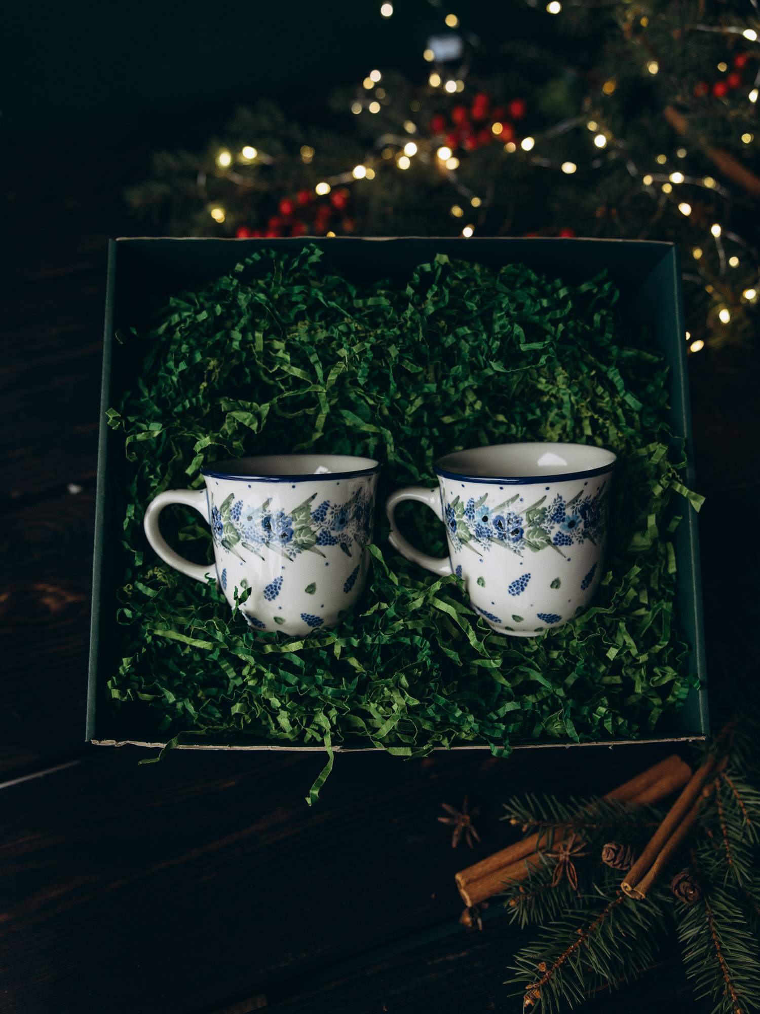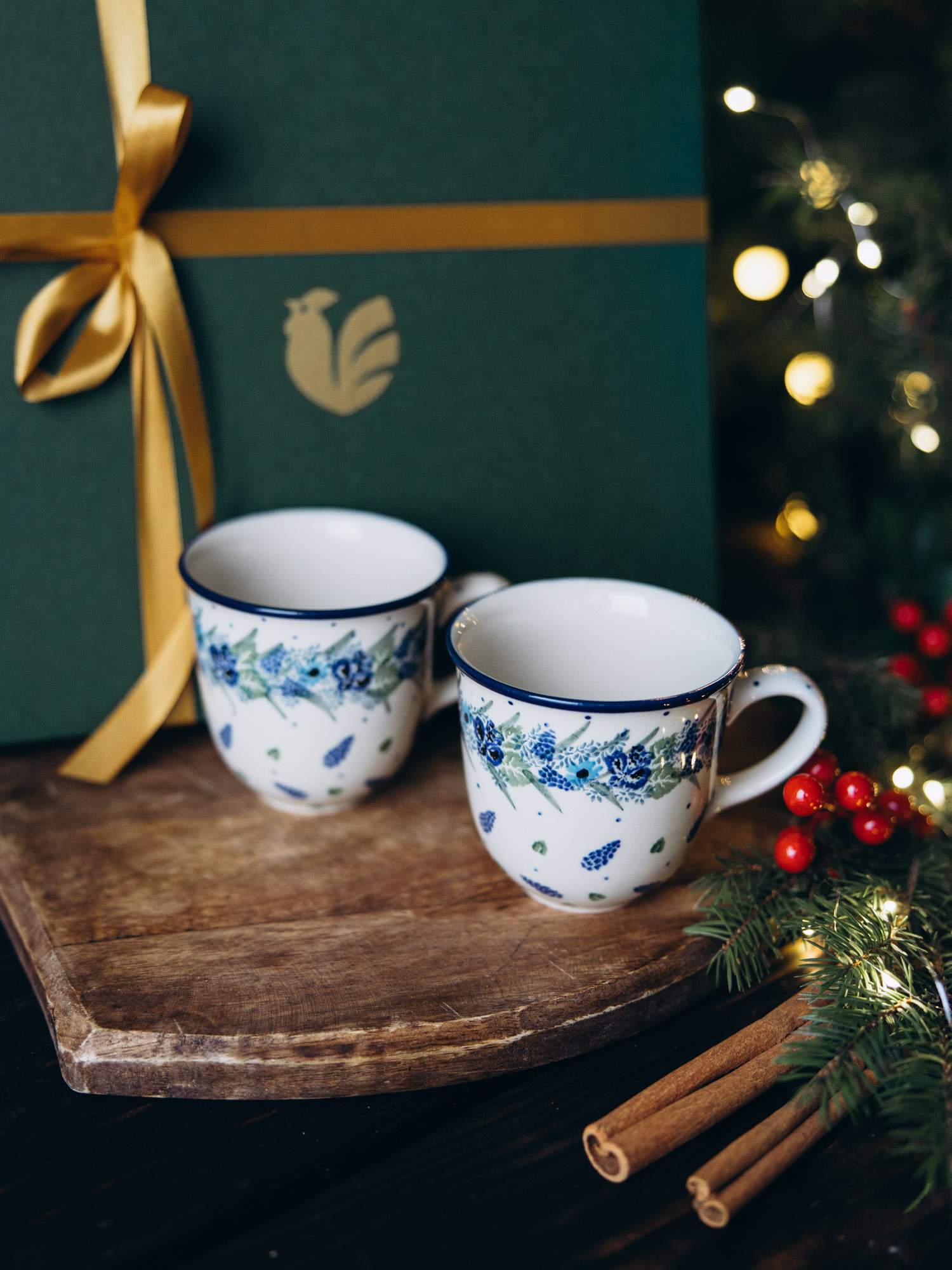 Zestaw dwóch kubków filiżankowych imitujących dużą filiżankę. Jasna ceramika została ozdobiona ręcznie, kobaltowo-zielonym wzorem wianka. Naczynie posiada subtelnie wywinięty brzeg oraz wygodny uchwyt. Kubki zapakowane są w zielone pudełko, wypełnione dekoracyjnymi wiórkami oraz ozdobione wstążką i złotym kogucikiem. Idealny zestaw na prezent.