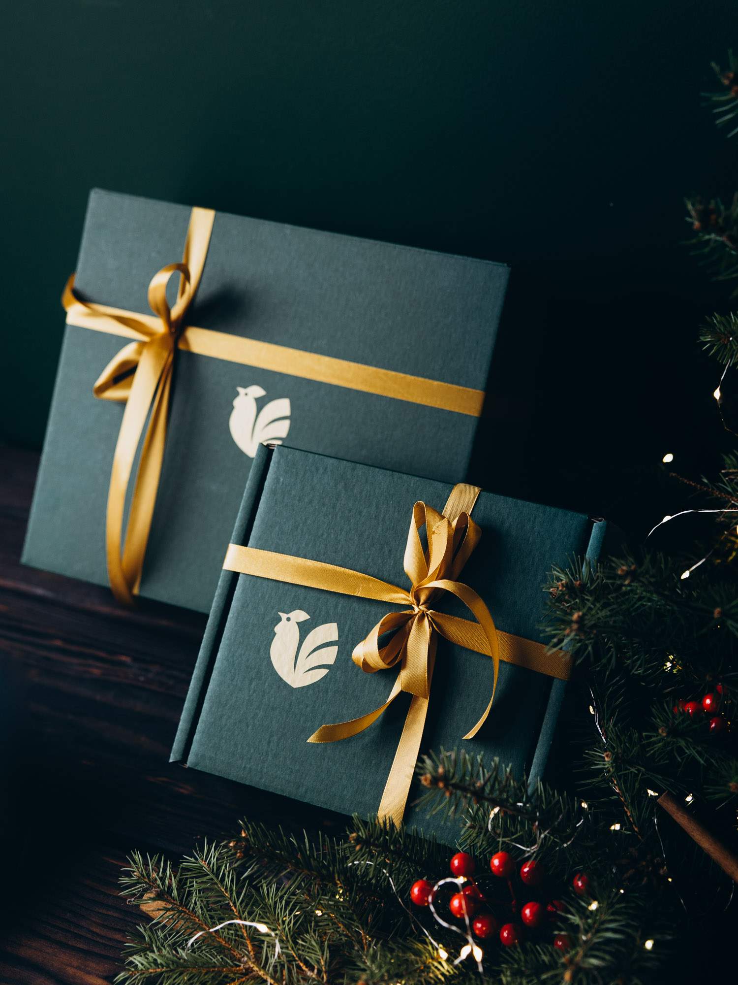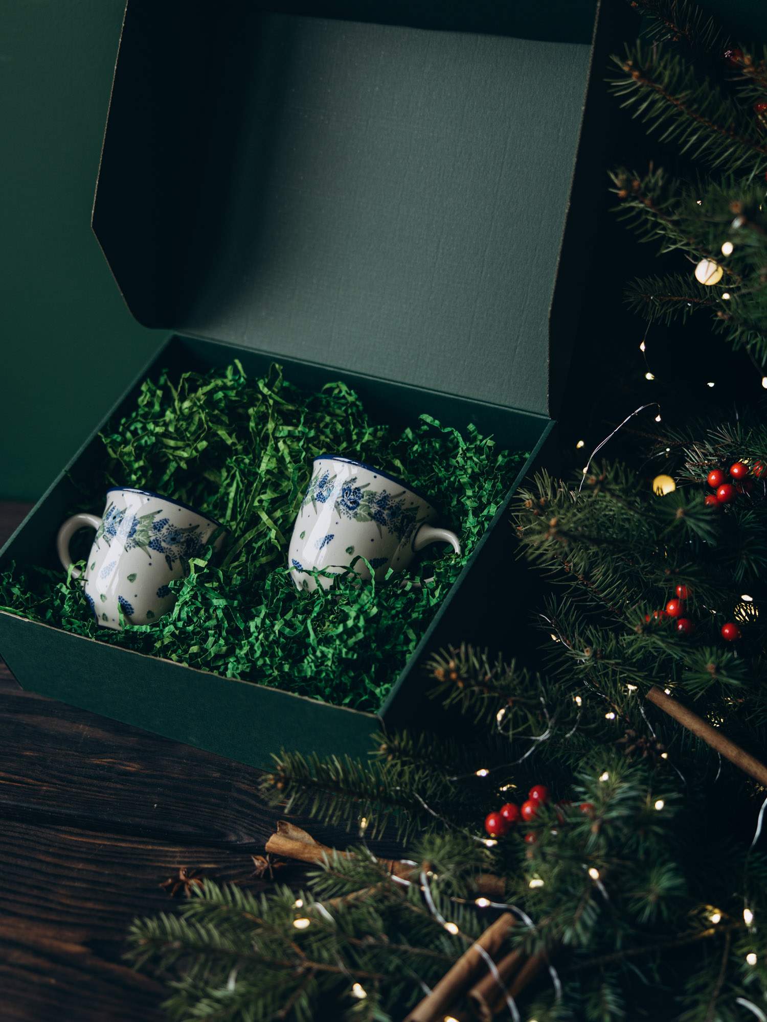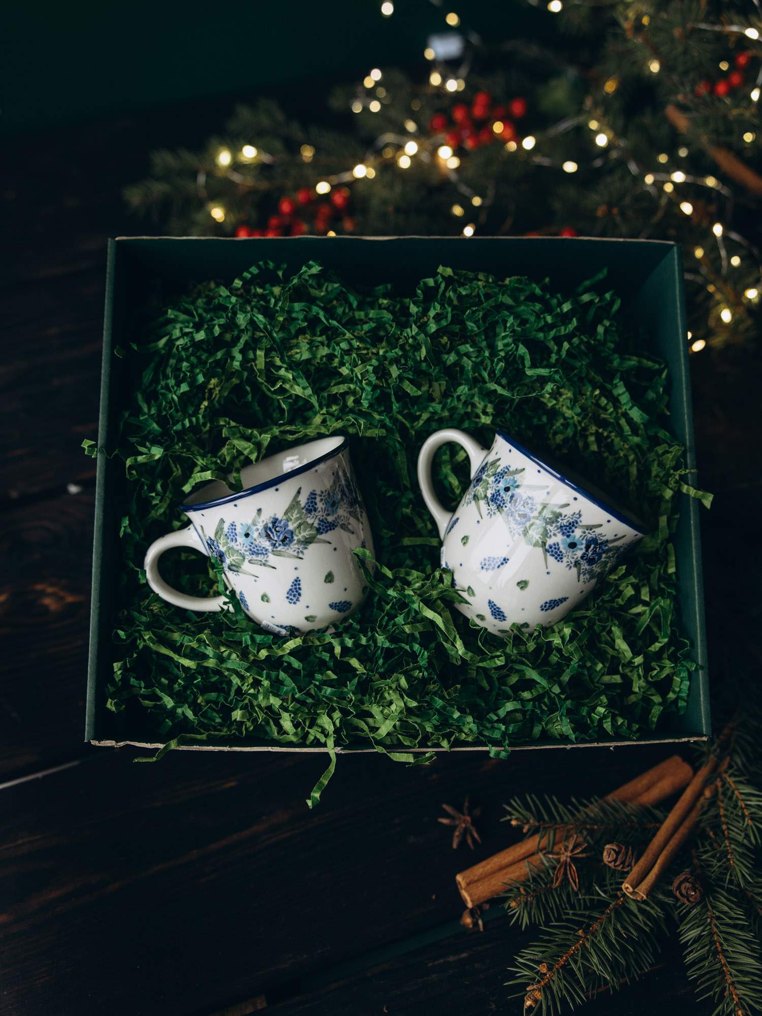 Zestaw dwóch kubków filiżankowych imitujących dużą filiżankę. Jasna ceramika została ozdobiona ręcznie, kobaltowo-zielonym wzorem wianka. Naczynie posiada subtelnie wywinięty brzeg oraz wygodny uchwyt. Kubki zapakowane są w zielone pudełko, wypełnione dekoracyjnymi wiórkami oraz ozdobione wstążką i złotym kogucikiem. Idealny zestaw na prezent.
