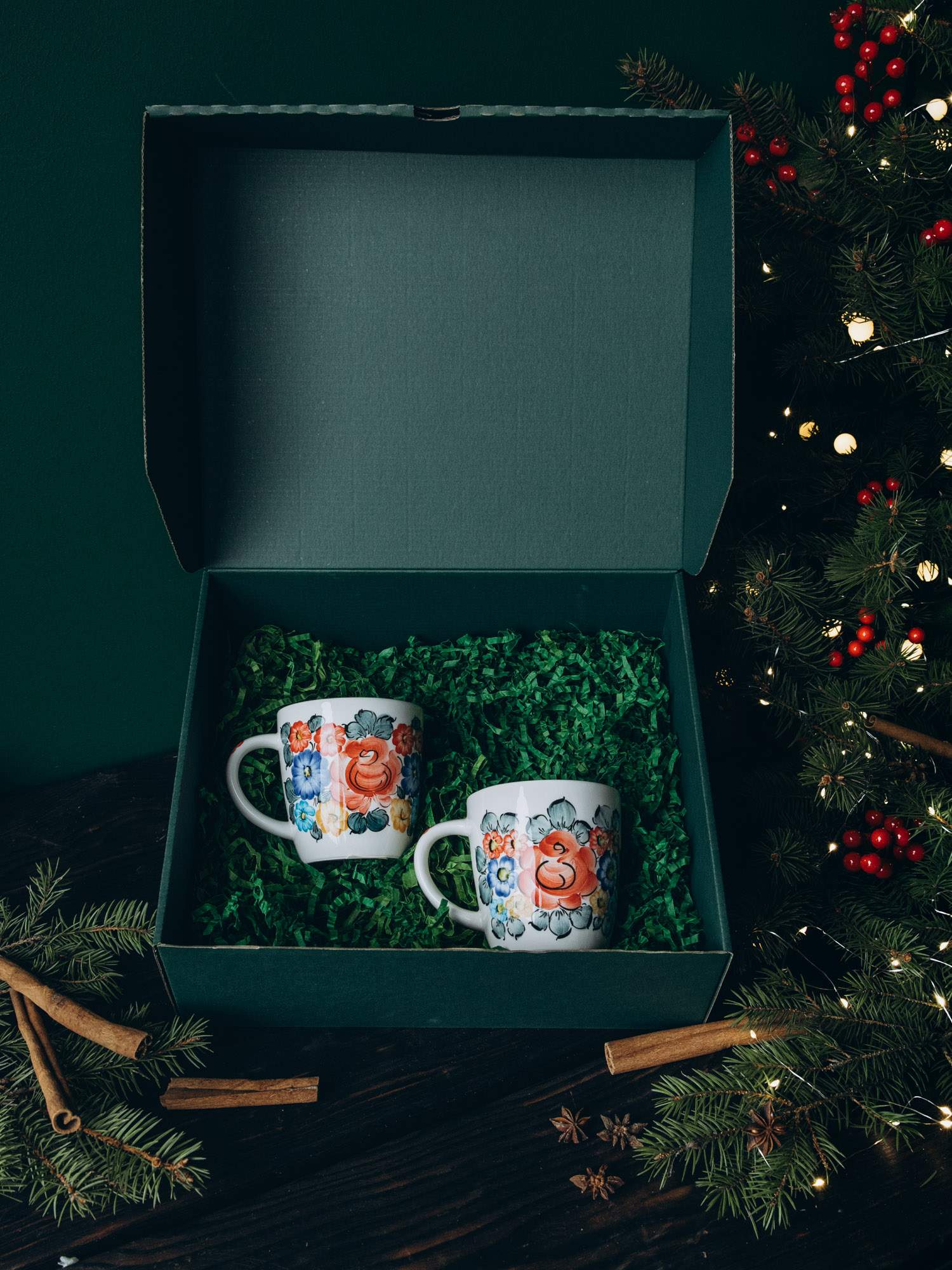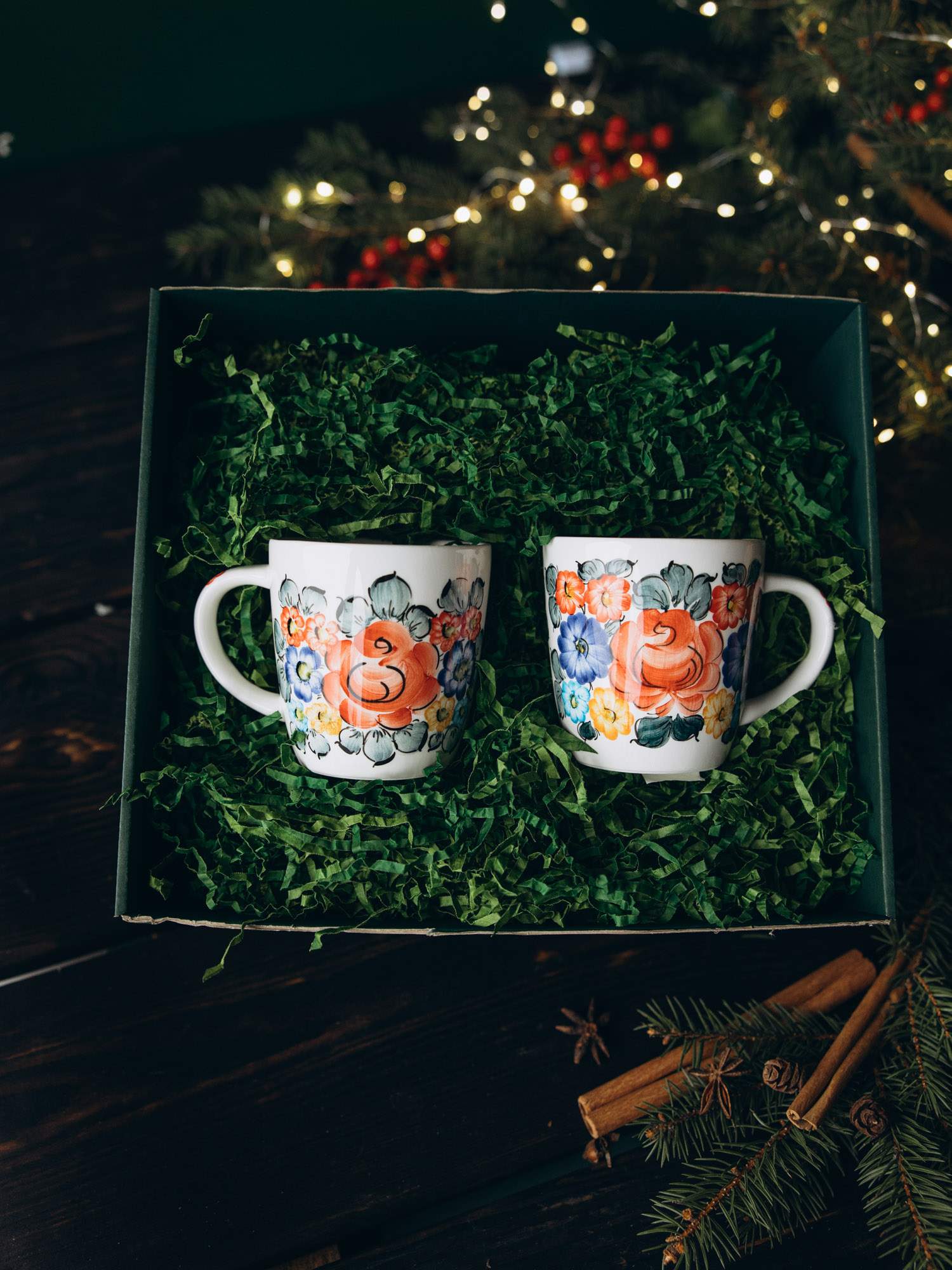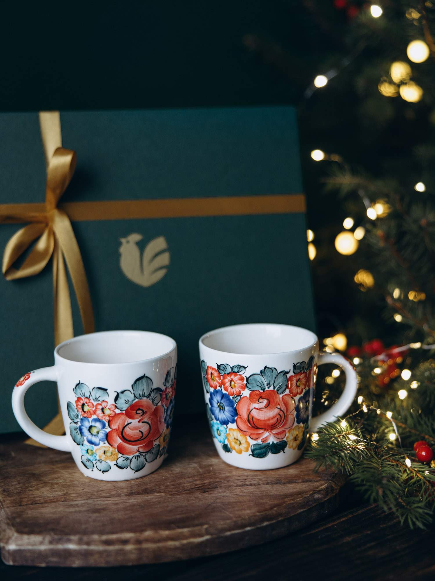 Zestaw solidnie wykonanych kubków ozdobionych kolorowym wzorem. Wygodny uchwyt i odporność na wysokie temperatury sprawiają, że jest praktyczny w użytkowaniu. Kubki zapakowane są w zielone pudełko, wypełnione dekoracyjnymi wiórkami oraz ozdobione wstążką i złotym kogucikiem. Idealny zestaw na prezent.