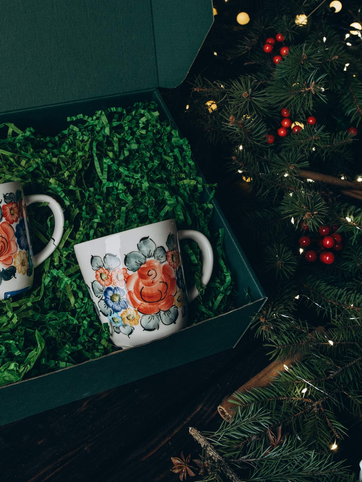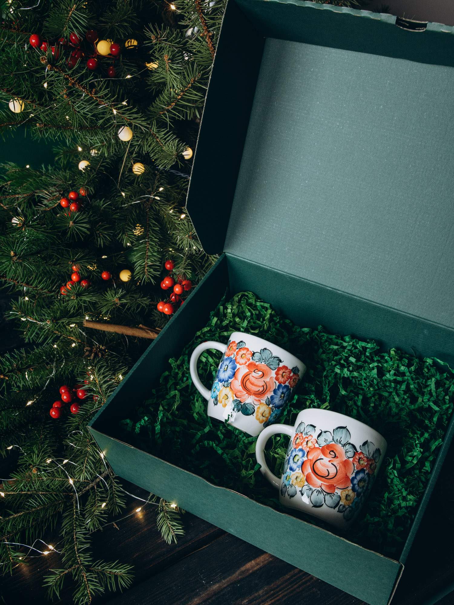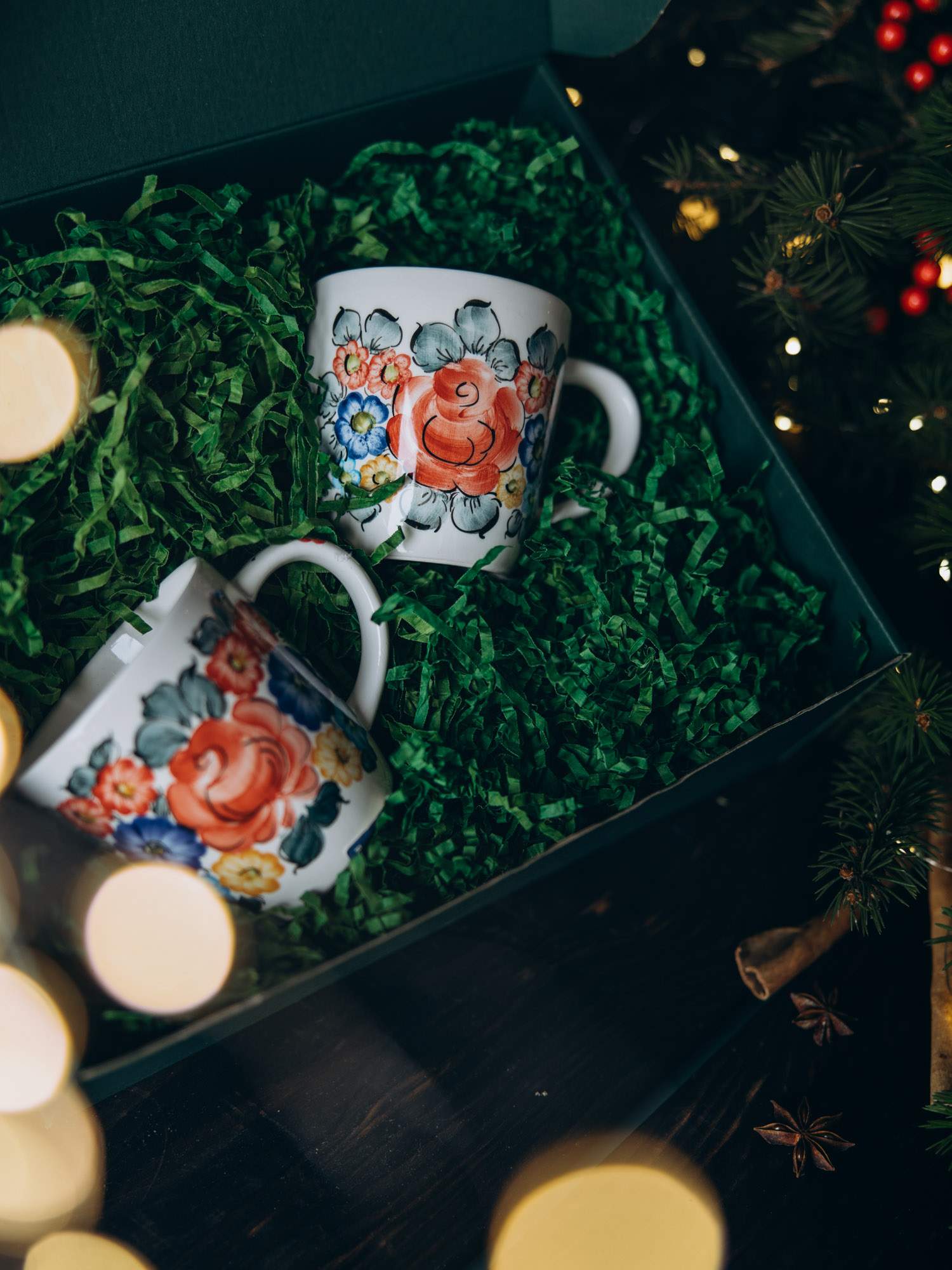 Zestaw solidnie wykonanych kubków ozdobionych kolorowym wzorem. Wygodny uchwyt i odporność na wysokie temperatury sprawiają, że jest praktyczny w użytkowaniu. Kubki zapakowane są w zielone pudełko, wypełnione dekoracyjnymi wiórkami oraz ozdobione wstążką i złotym kogucikiem. Idealny zestaw na prezent.
