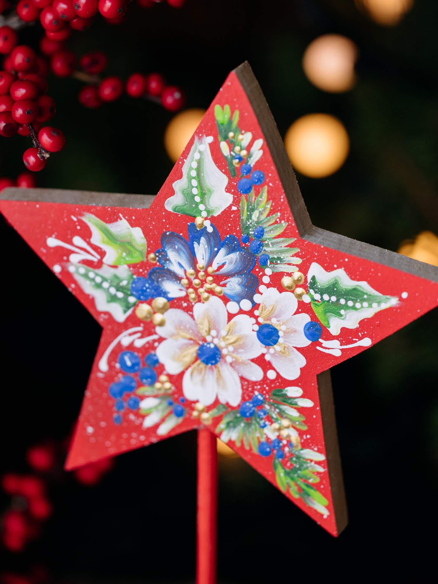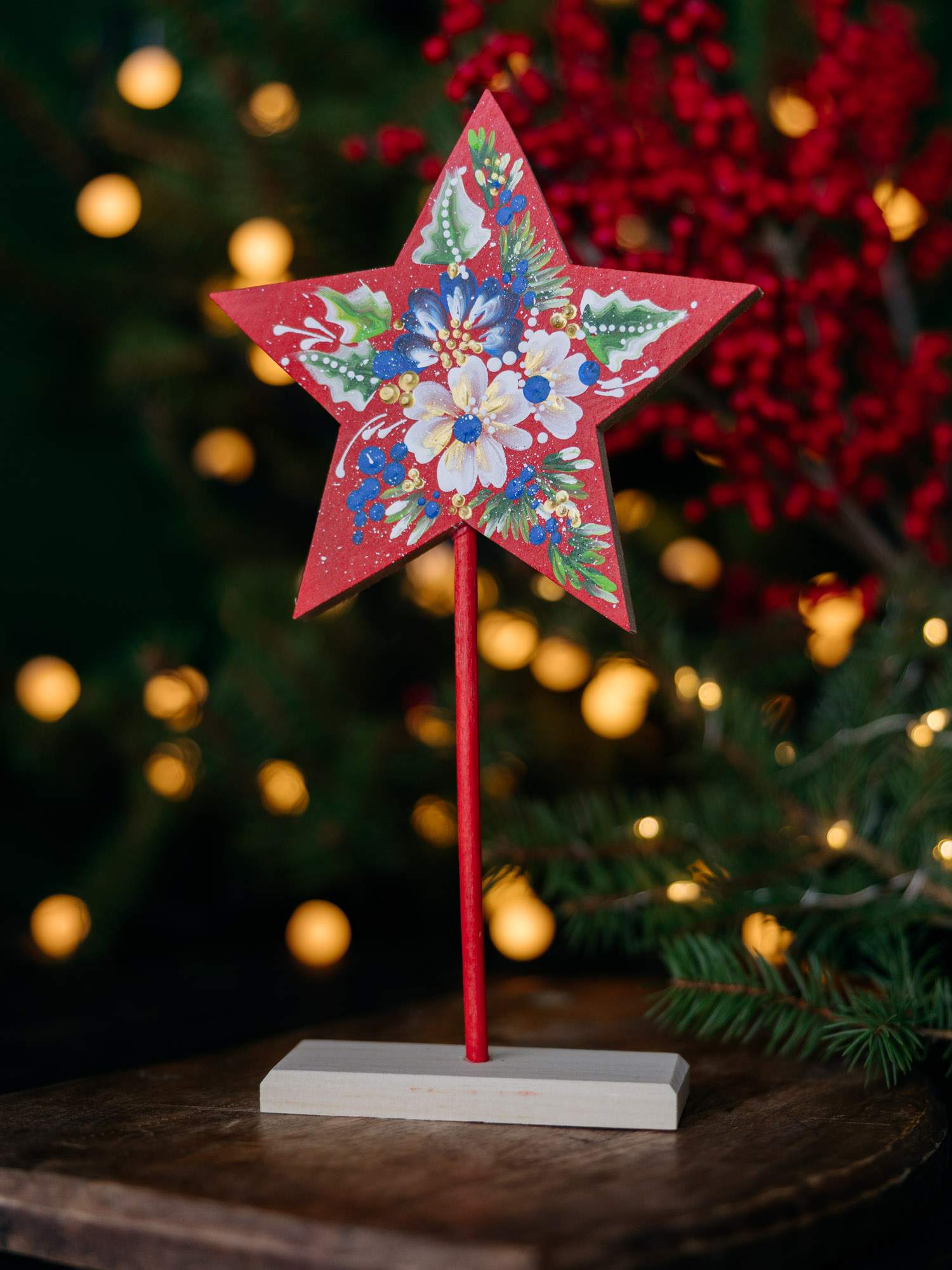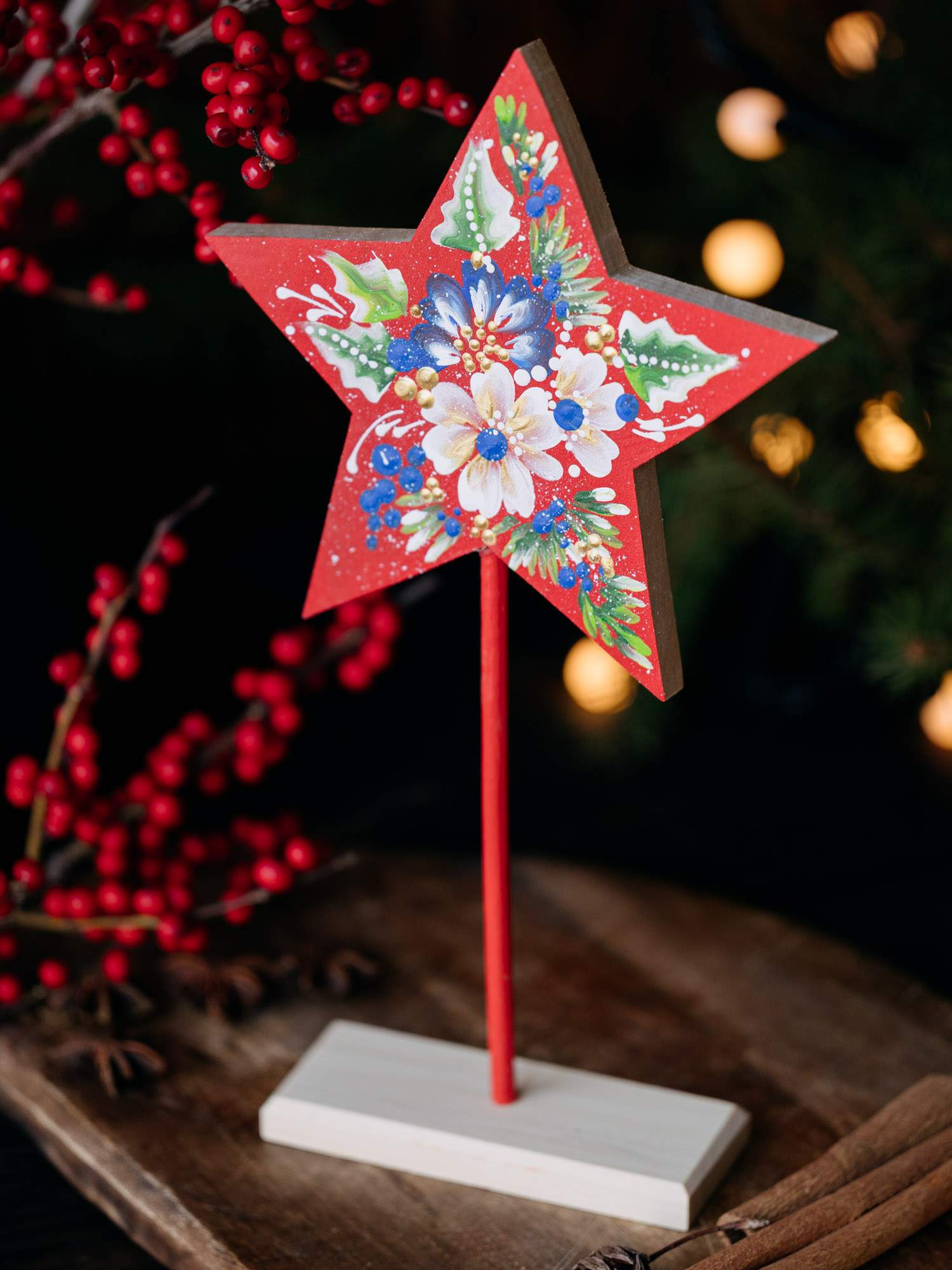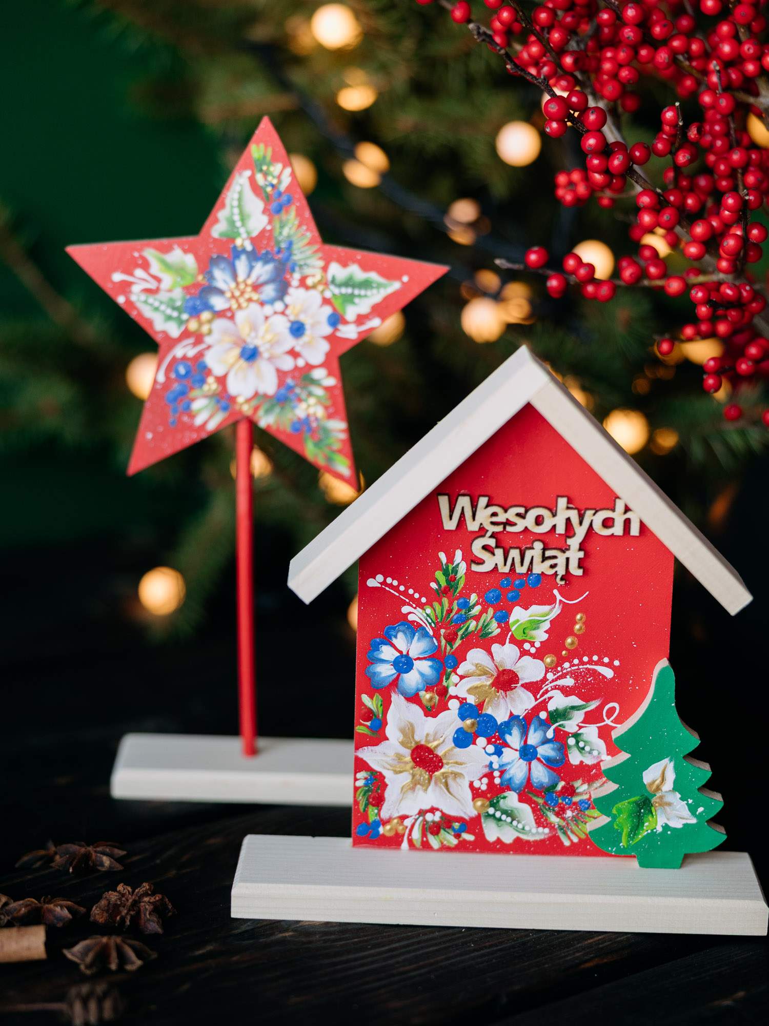 Zestaw świąteczny w odcieniu czerwieni składający się z drewnianego domku oraz dużej gwiazdki. Przód domku został ozdobiony motywem kwiatowym oraz napisem ,,Wesołych Świąt". Obok znajduje się mała zielona choinka. Duża gwiazdka ozdobiona takim samym motywem kwiatowym. Zestaw idealny na prezent.