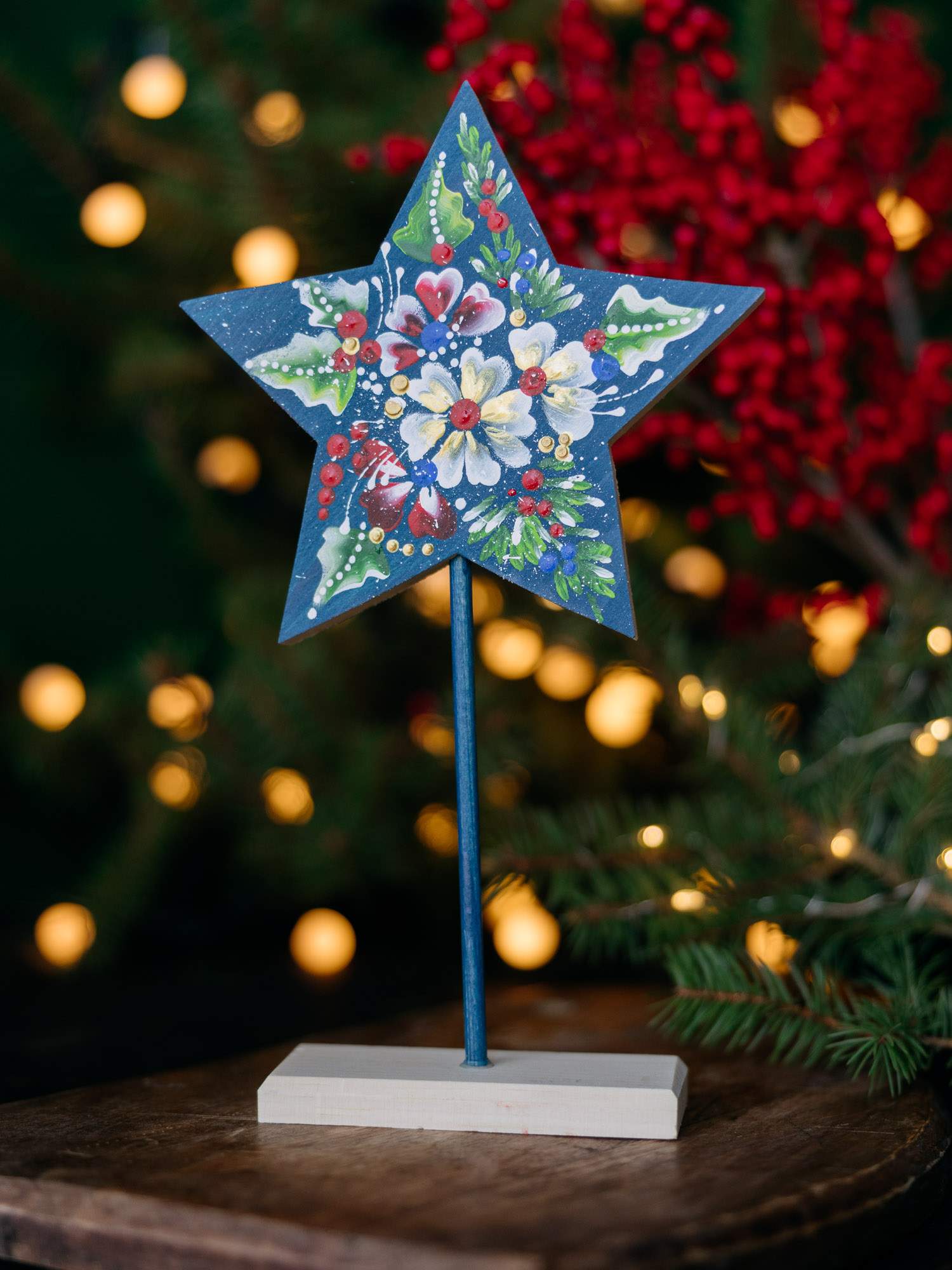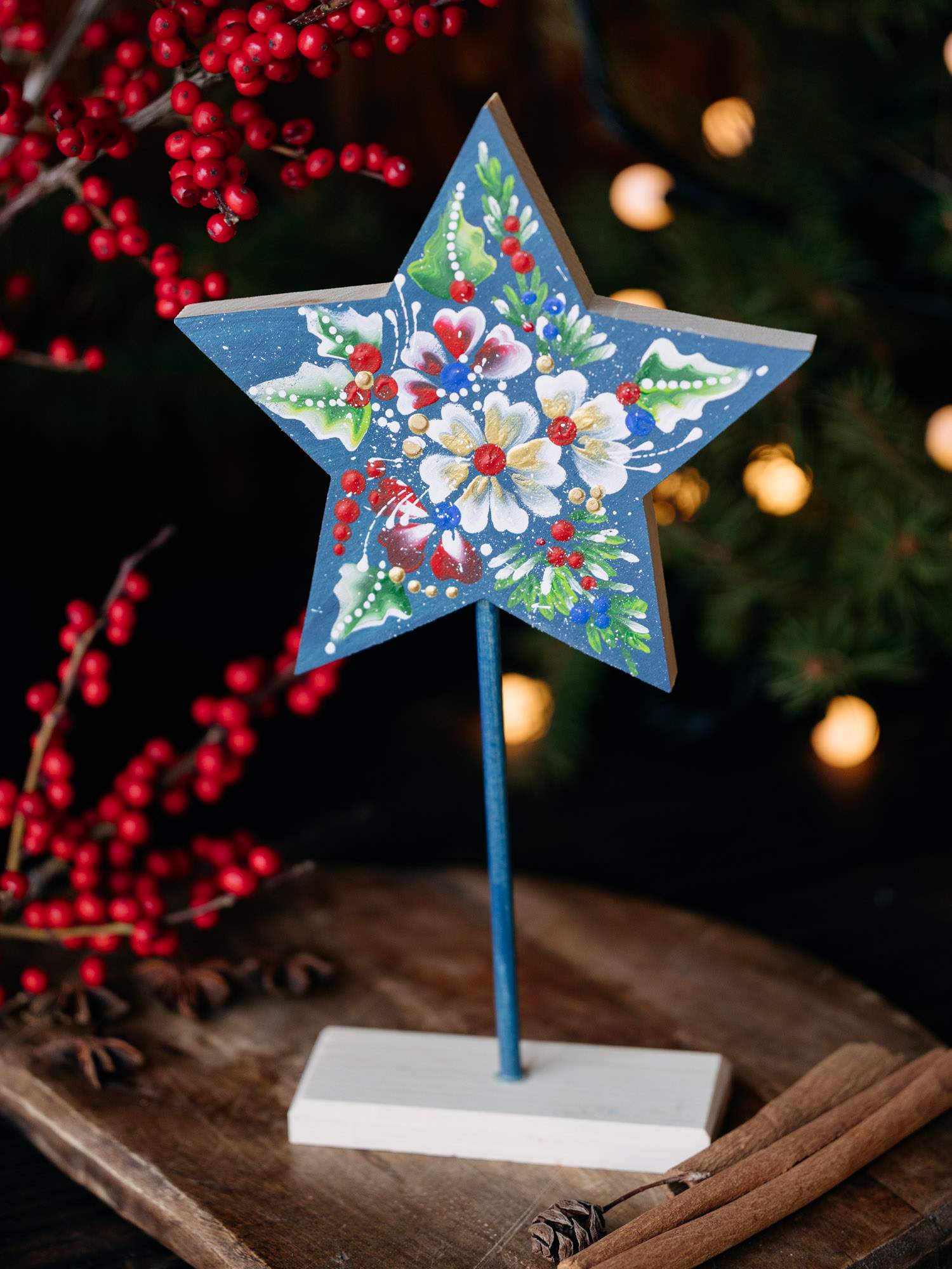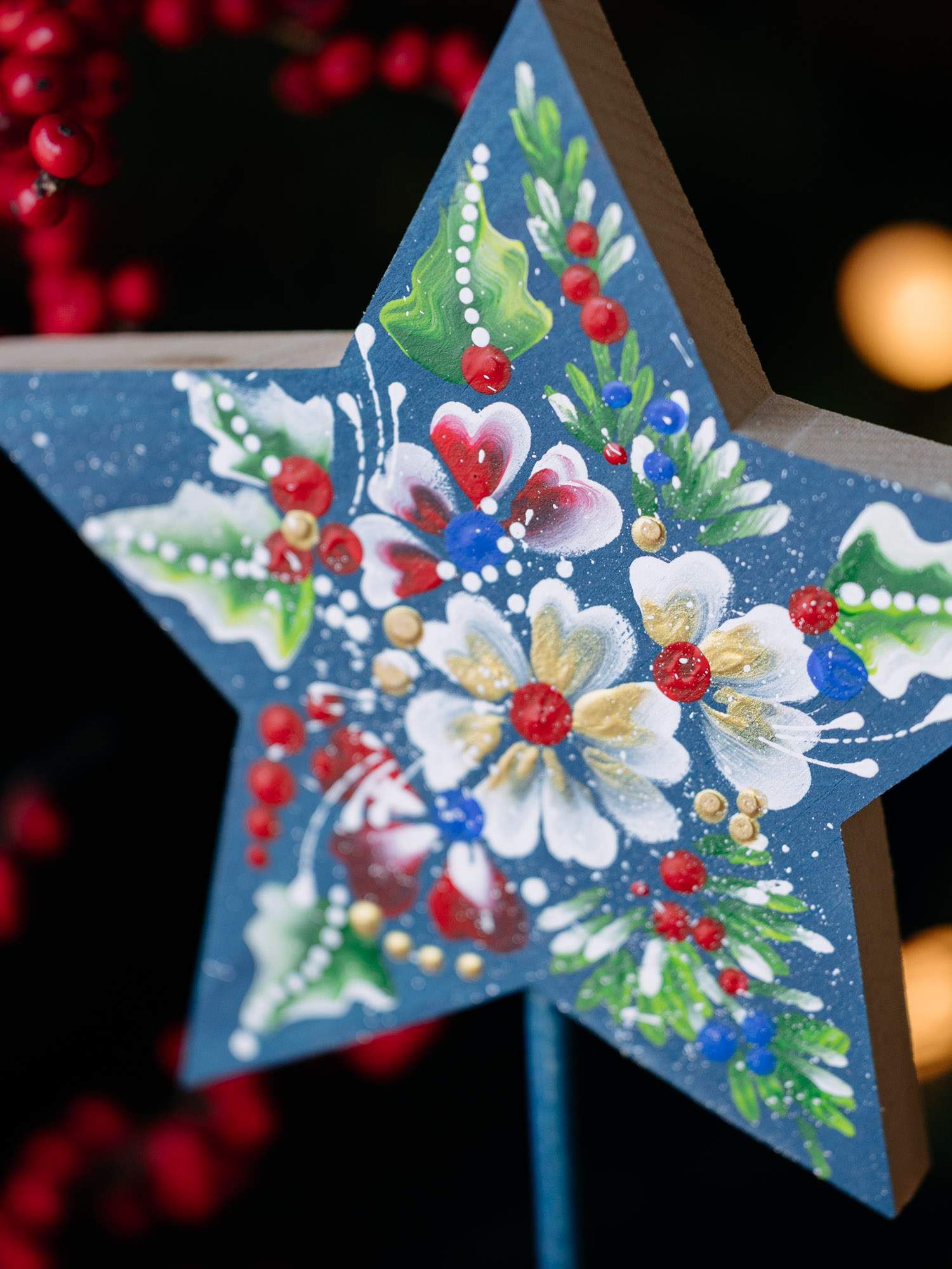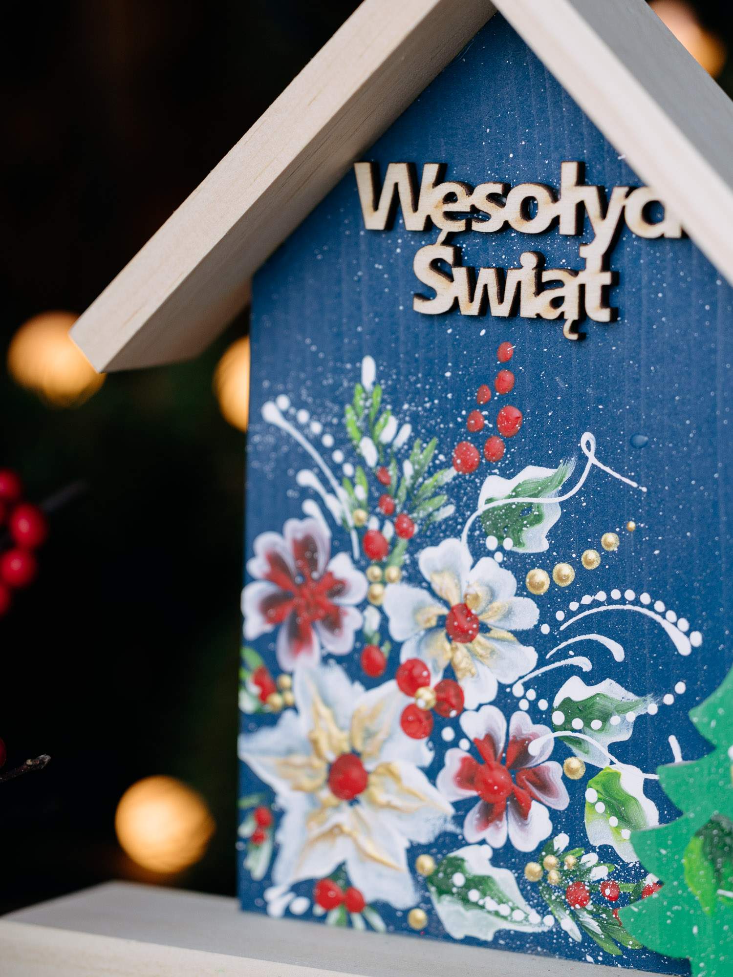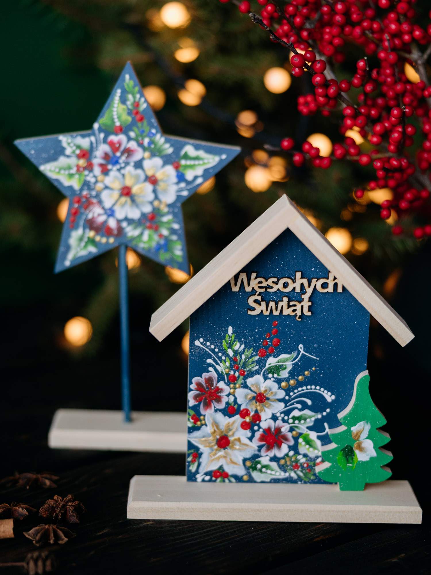 Dekoracyjny zestaw świąteczny składający się z drewnianego domku oraz dużej gwiazdki. Przód domku został ozdobiony motywem kwiatowym oraz napisem ,,Wesołych Świąt". Obok znajduje się mała zielona choinka. Duża gwiazdka ozdobiona takim samym motywem kwiatowym. Zestaw idealny na prezent.