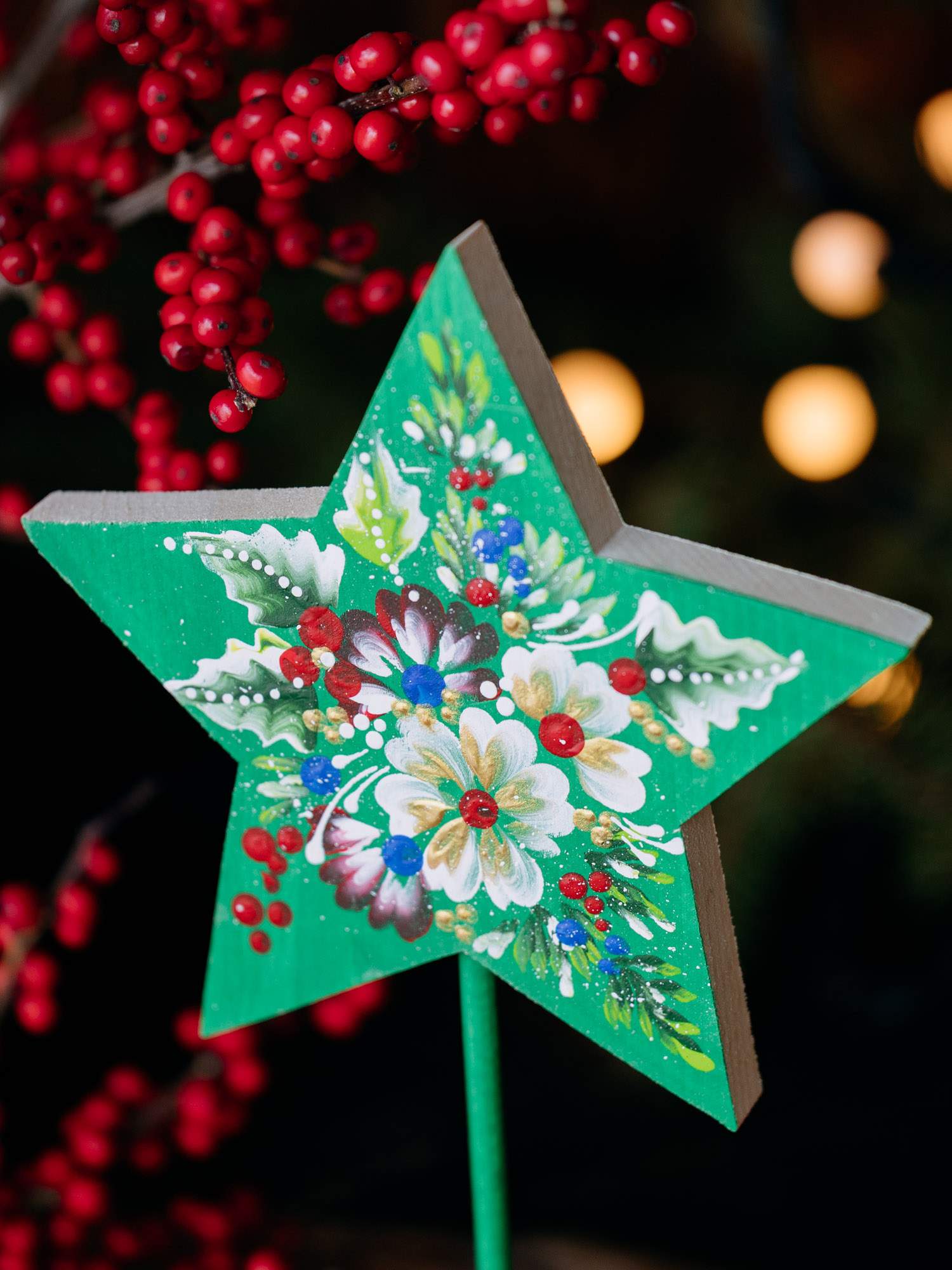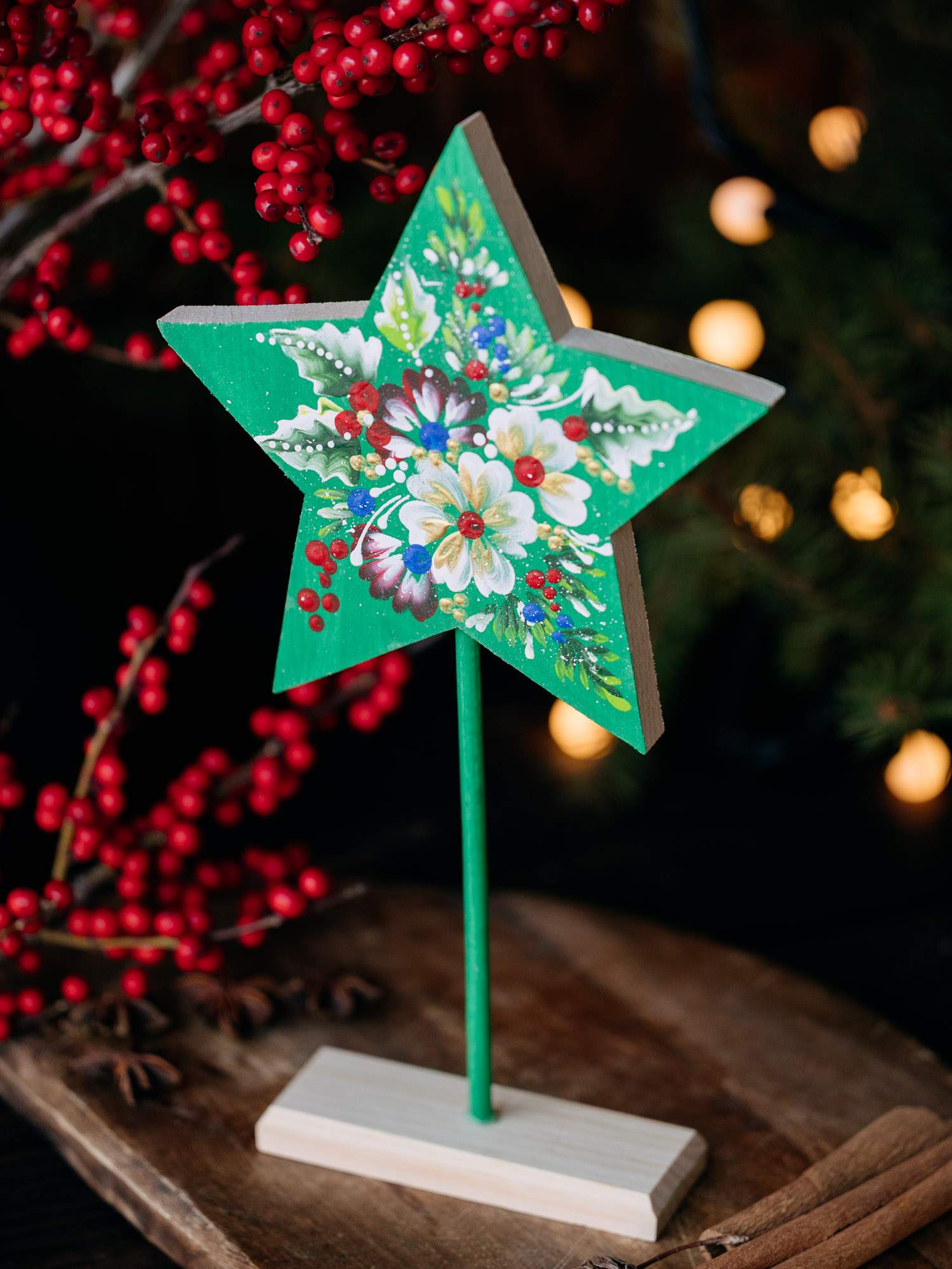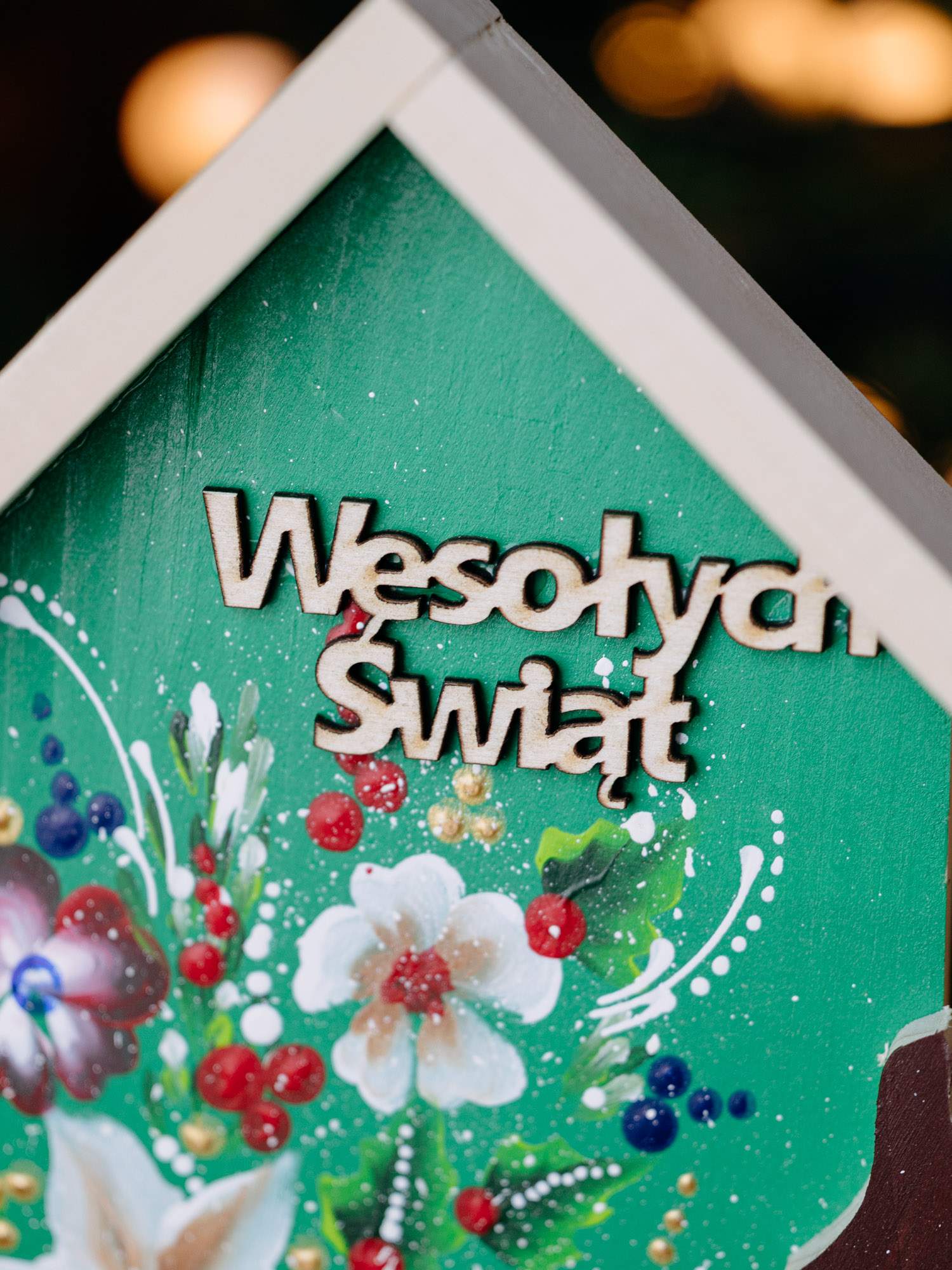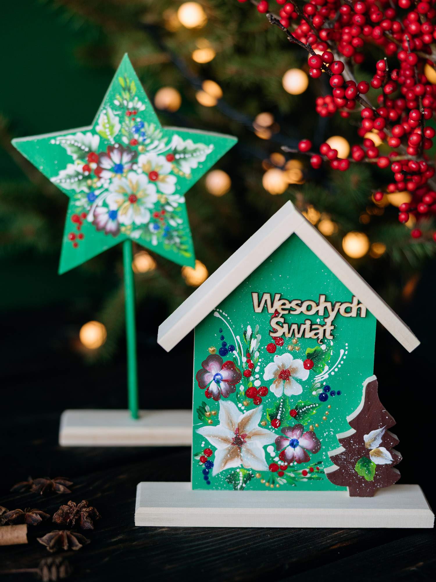 Świąteczny zestaw drewnianych dekoracji składający się z domku oraz dużej gwiazdki. Przód domku został ozdobiony motywem kwiatowym oraz napisem ,,Wesołych Świąt". Obok znajduje się mała brązowa choinka. Duża gwiazdka ozdobiona takim samym motywem kwiatowym. Zestaw idealny na prezent.